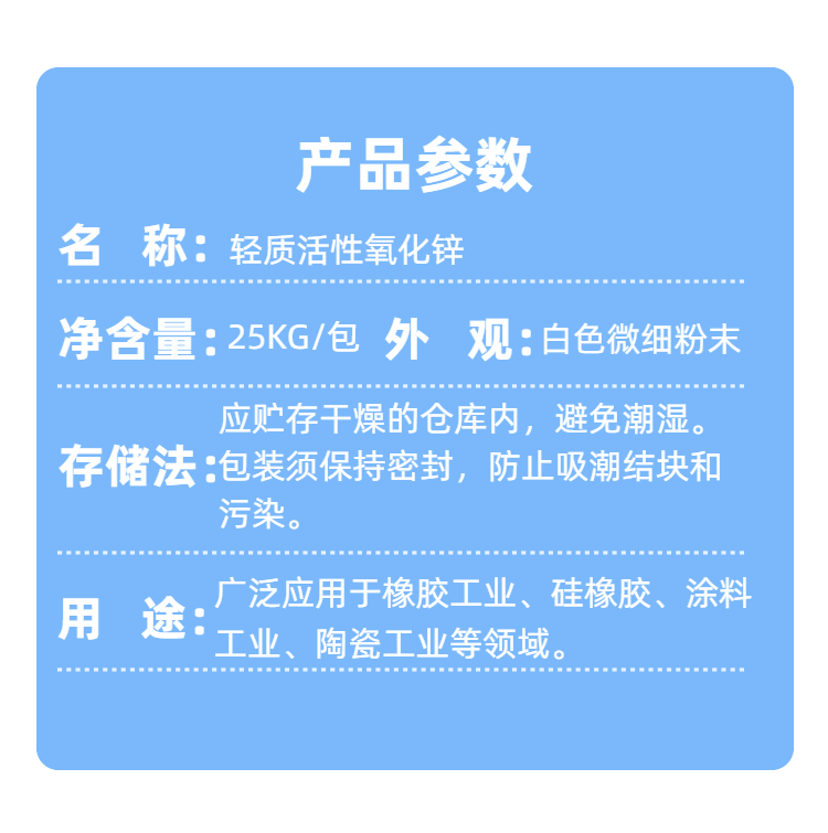 本品符合化工行業標準HG/T 2572-2020《活性氧化鋅》的要求,其主要技術指標如下: