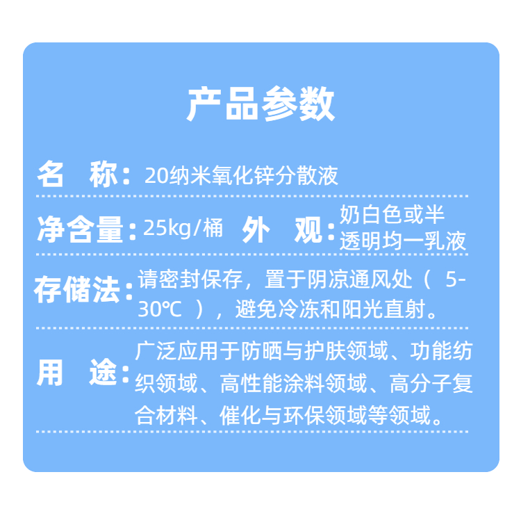 20納米氧化鋅分散液是由肇慶市新潤豐高新材料有限公司采用高能球磨和液相化學法結合精密分散技術制備而成的一款高性能納米材料分散液。本品將平均粒徑約為20納米的氧化鋅顆粒通過獨特的表面改性劑均勻、穩定地分散在水性介質中,形成奶白色的均一分散體系。該產品有效解決了納米粉體易團聚、難分散的行業難題,使用者可直接、高效地利用納米氧化鋅的優異特性,輕松將其添加到各種基體材料中。